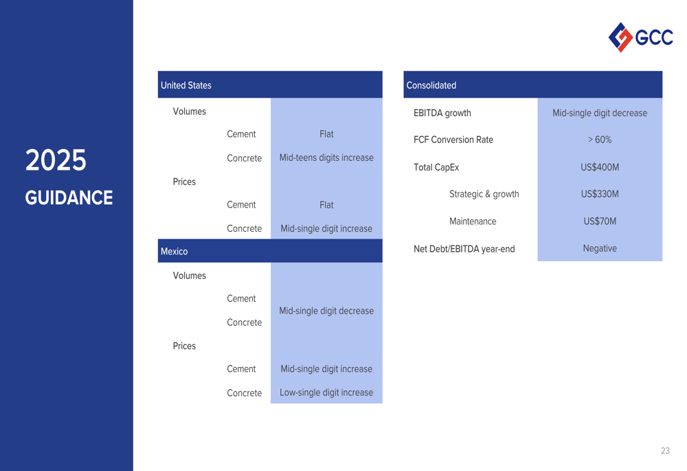 Looking ahead, GCC provided revised guidance for 2025, expecting flat cement volumes in the United States and a mid-teens increase in concrete volumes. In Mexico, both cement and concrete volumes are projected to decrease by mid-single digits.