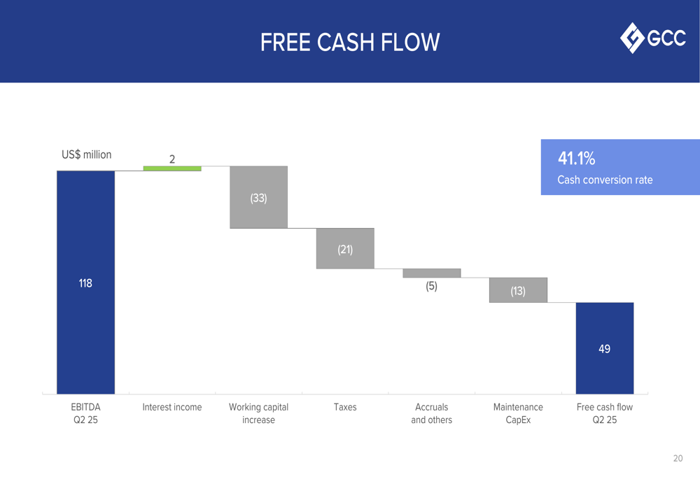 The following waterfall chart breaks down the components of GCC’s free cash flow: