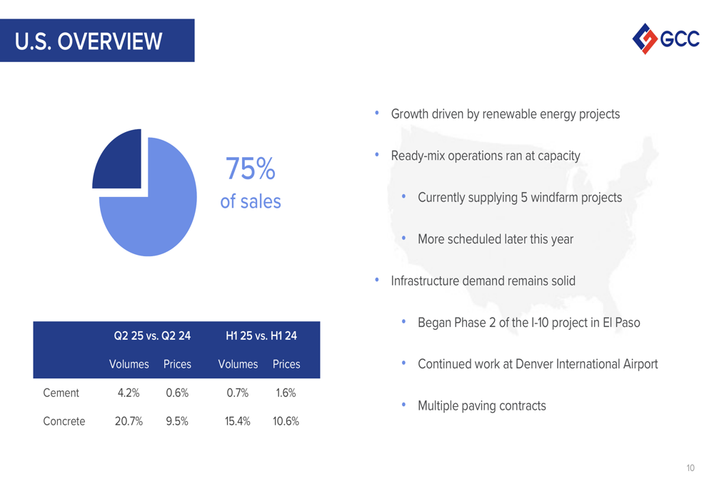 The U.S. market, which accounts for 75% of GCC’s sales, delivered strong results with cement volumes increasing 4.2% and prices rising 0.6%. Ready-mix concrete operations showed even stronger performance with volumes up 20.7% and prices increasing 9.5%.
