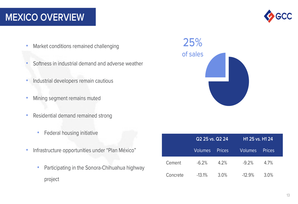The Mexican market faced softness in industrial demand and adverse weather conditions, with industrial developers remaining cautious and mining activity muted. However, residential demand remained strong, supported by federal housing initiatives, and the company is participating in infrastructure opportunities under "Plan México," including the Sonora-Chihuahua highway project.