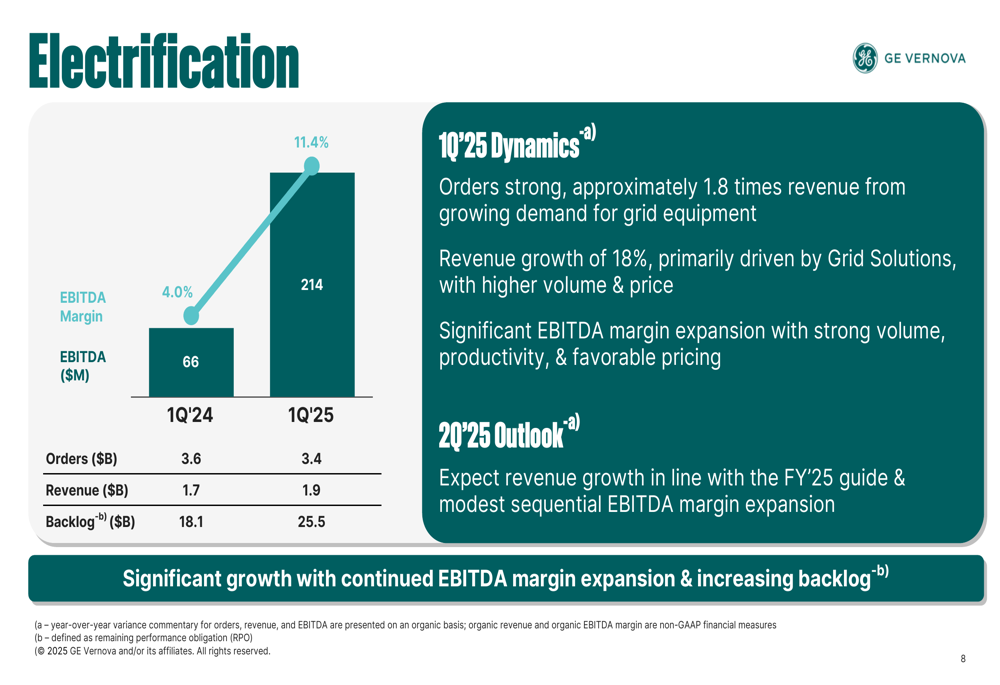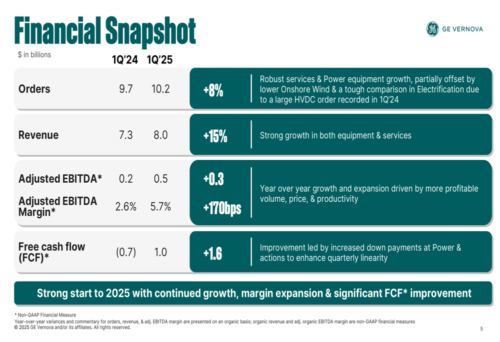 GE Vernova delivered impressive financial results in Q1 2025, with revenue growing 15% year-over-year to $8.0 billion. Orders increased 8% to $10.2 billion, while adjusted EBITDA more than doubled to $0.5 billion, representing a margin expansion of 170 basis points to 5.7%.