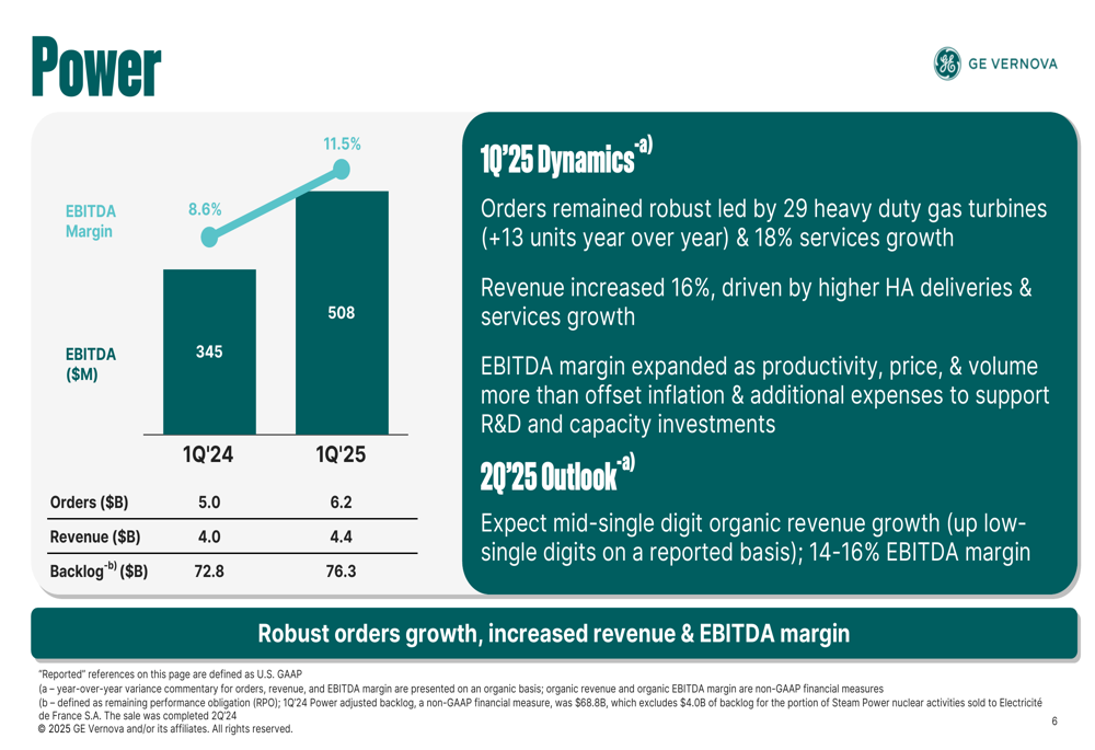 The Power segment delivered strong performance with orders of $6.2 billion, up from $5.0 billion in Q1 2024. Revenue increased 16% to $4.4 billion, driven by higher HA gas turbine deliveries and 18% services growth. The segment’s EBITDA margin expanded from 8.6% to 11.5% as productivity, price, and volume more than offset inflation and additional expenses related to R&D and capacity investments.