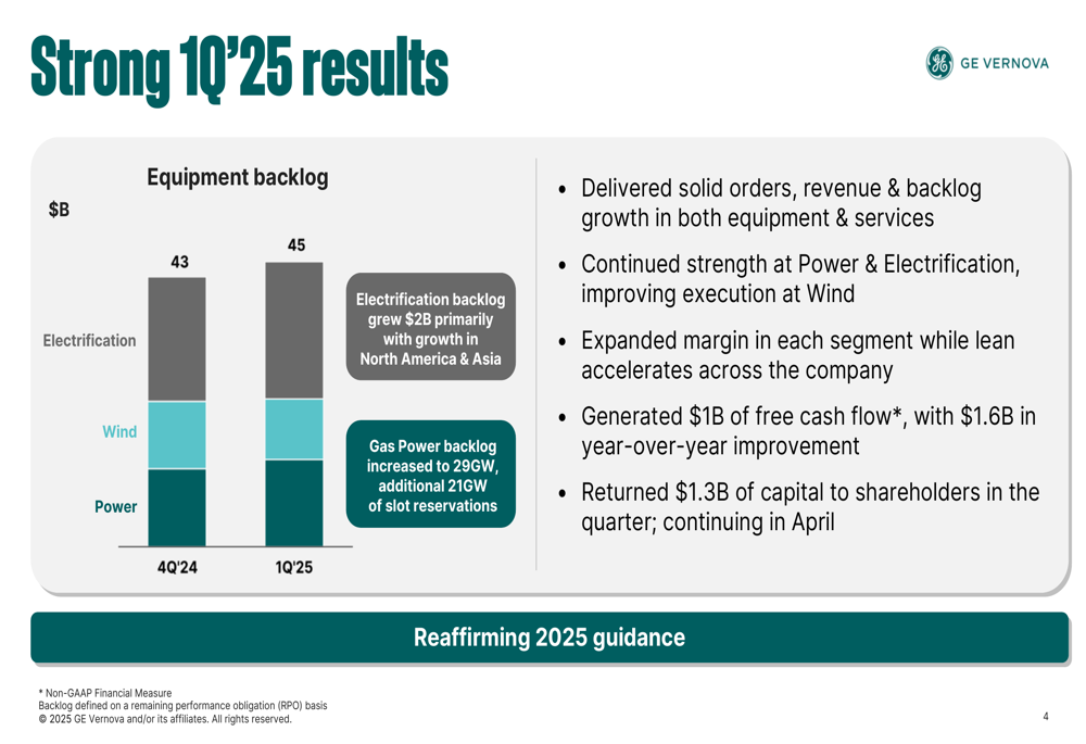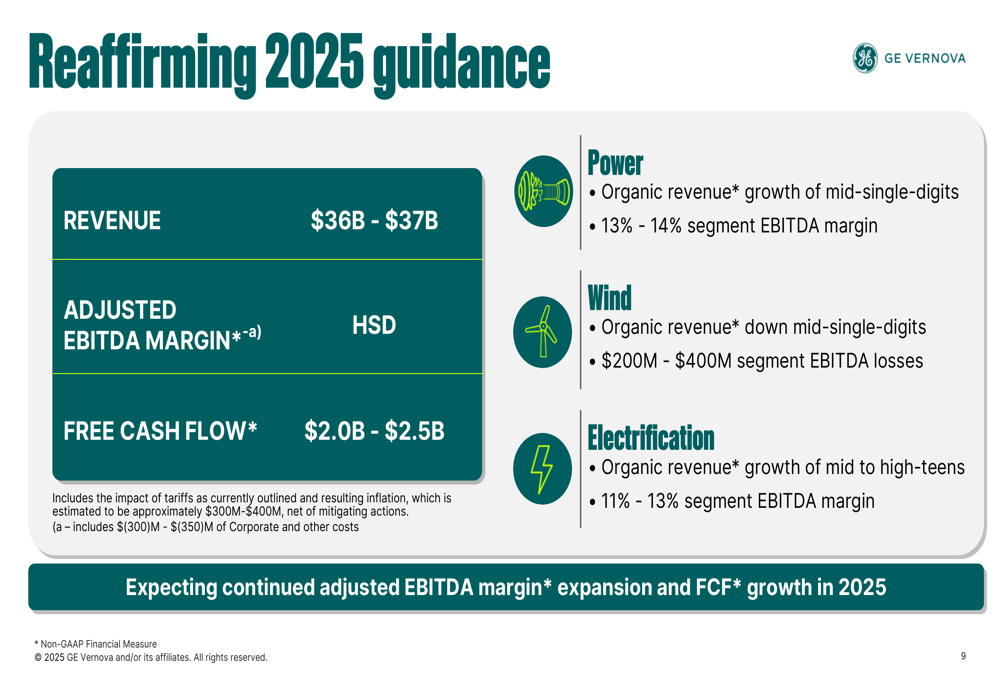 GE Vernova reaffirmed its 2025 guidance, projecting revenue of $36-37 billion, adjusted EBITDA margin in the high single digits, and free cash flow of $2.0-2.5 billion. The guidance includes the impact of tariffs as currently outlined and resulting inflation, estimated at approximately $300-400 million, net of mitigating actions.
