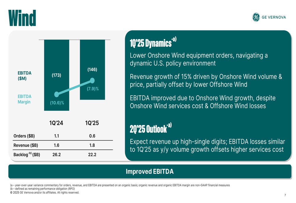 The Wind segment faced challenges but showed signs of improving execution. While orders decreased from $1.1 billion to $0.6 billion due to a dynamic U.S. policy environment, revenue grew 15% to $1.8 billion, driven by Onshore Wind volume and price improvements. EBITDA losses narrowed from $173 million to $146 million, with margin improving from -10.6% to -7.9%.