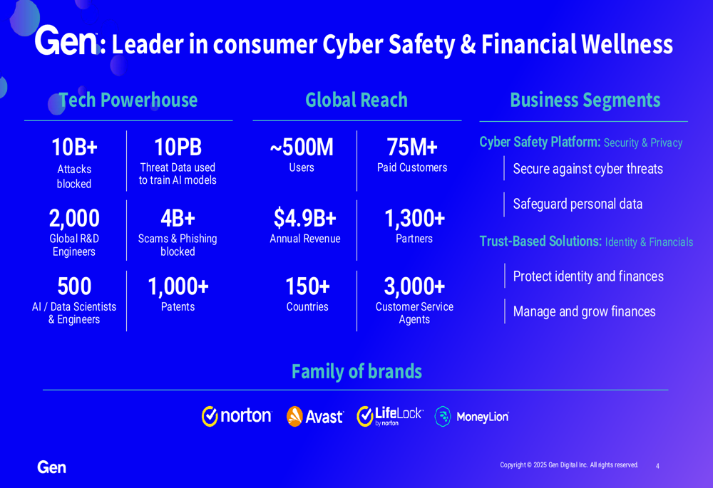 Gen Digital positions itself as a leader in consumer cyber safety and financial wellness, with approximately 500 million users across 150+ countries and 75+ million paid customers. The company's dual focus on cyber protection and financial services appears to be gaining traction as digital threats become increasingly sophisticated.
