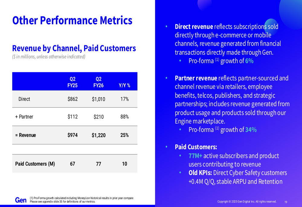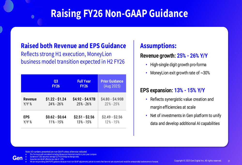 The company's raised guidance is based on expectations of high-single digit pro-forma growth and a MoneyLion exit growth rate of approximately 30%. Gen Digital also noted that its EPS expansion reflects synergistic value creation and margin efficiencies at scale, net of investments in the Gen platform to unify data and develop additional AI capabilities.