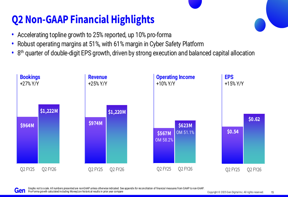 Gen Digital reported Q2 FY26 revenue of $1.22 billion, representing a 25% increase year-over-year. On a pro-forma basis (including MoneyLion in the prior year baseline), revenue grew 10%. Non-GAAP earnings per share reached $0.62, up 15% year-over-year, marking the eighth consecutive quarter of double-digit EPS growth.