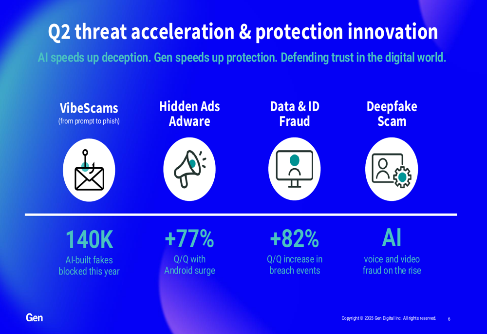 Gen Digital is heavily investing in AI capabilities to enhance its product offerings and combat evolving cyber threats. The company highlighted several key threat vectors that accelerated during Q2, including AI-built fake content, hidden ads adware, data and identity fraud, and deepfake scams.