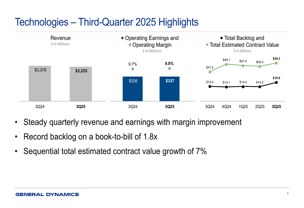 While revenue was relatively flat at $3.33 billion, operating earnings increased slightly to $327 million, with operating margin improving to 9.8%. The segment achieved a book-to-bill ratio of 1.8x, resulting in record backlog and sequential total estimated contract value growth of 7%.