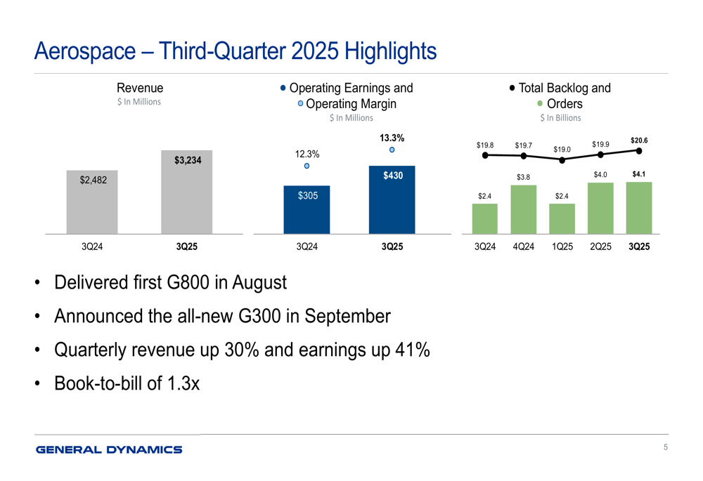Aerospace revenue surged 30% to $3.23 billion, while operating earnings jumped 41% to $430 million. Operating margin improved by 100 basis points to 13.3%. The segment achieved a book-to-bill ratio of 1.3x, indicating strong future demand. Key milestones included the delivery of the first G800 aircraft in August and the announcement of the all-new G300 model in September, positioning the company for continued growth in the business jet market.