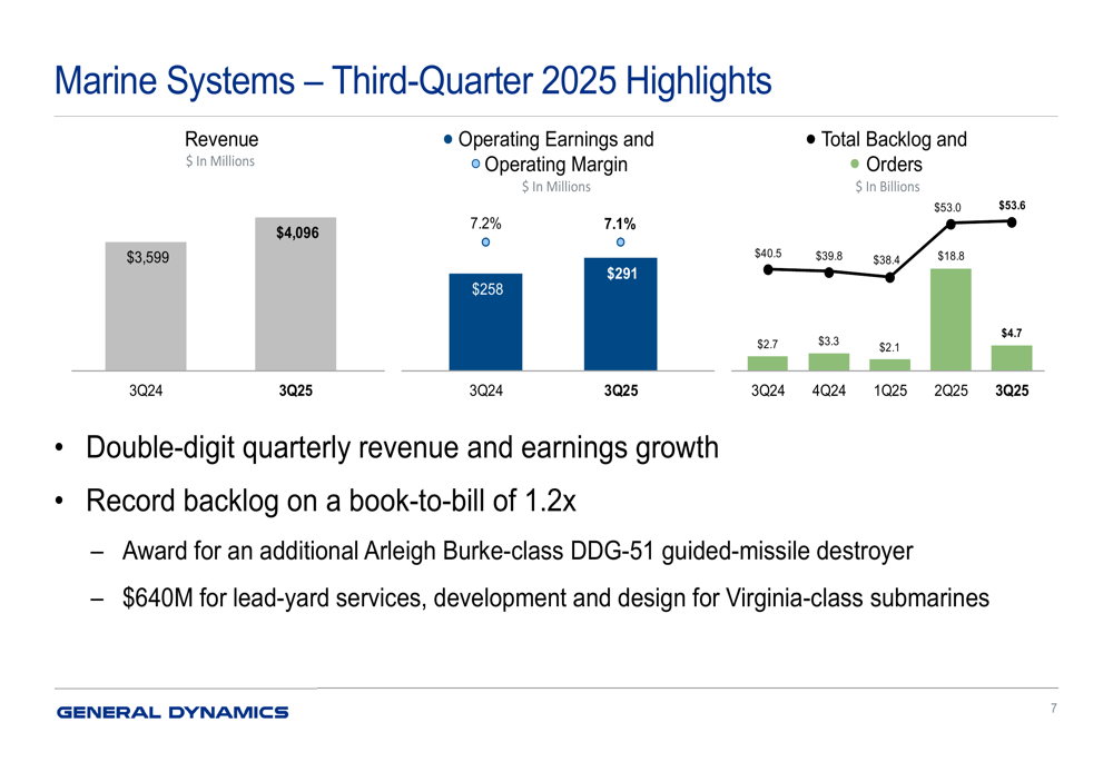 Revenue grew by double digits to $4.1 billion, while operating earnings increased to $291 million. The segment achieved record backlog of $53.6 billion with a book-to-bill ratio of 1.2x. Key contract awards included an additional Arleigh Burke-class DDG-51 guided-missile destroyer and $640 million for lead-yard services, development, and design for Virginia-class submarines.