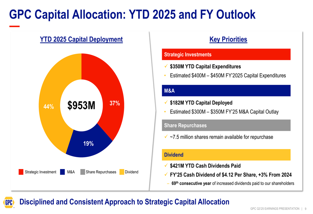 The company’s year-to-date capital allocation reflects these priorities, with 44% directed toward strategic investments, 37% to share repurchases, and 19% to mergers and acquisitions. GPC has deployed $350 million in capital expenditures year-to-date and expects to invest $400-$450 million for the full year 2025.