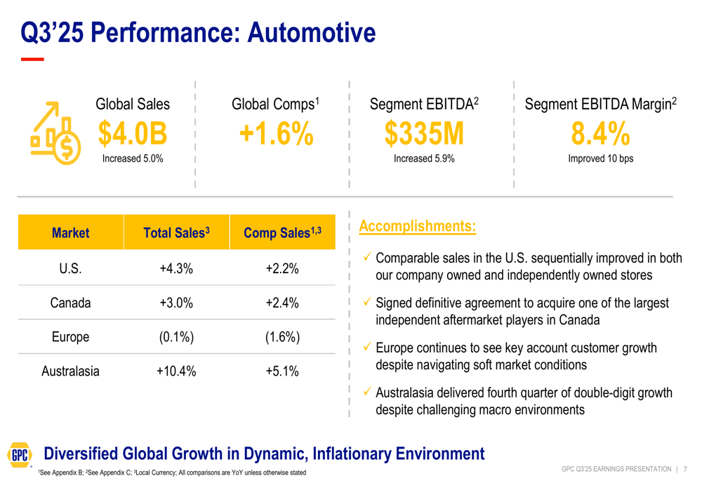 GPC’s business is divided into two primary segments: Automotive, representing 63% of total revenue, and Industrial, accounting for the remaining 37%. Both segments demonstrated growth during the quarter despite varying market conditions.