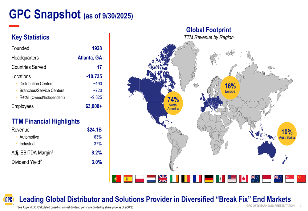 GPC’s global footprint continues to be a strategic advantage, with operations spanning 17 countries through approximately 10,735 locations and over 63,000 employees. The company’s snapshot provides a comprehensive overview of its global presence: