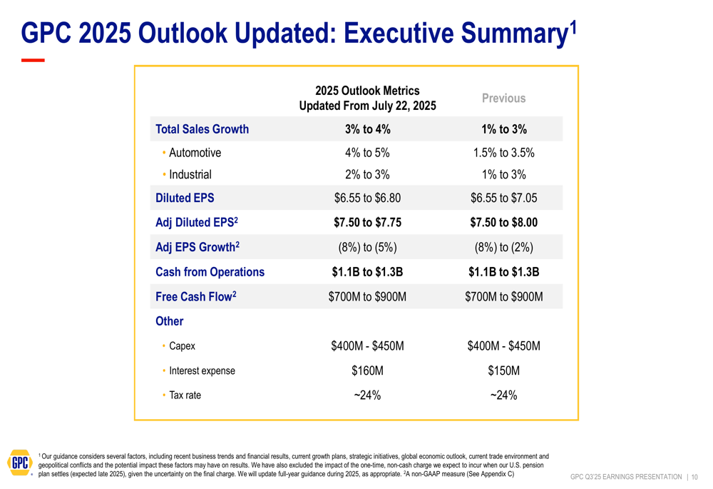 Based on its year-to-date performance, GPC raised its full-year 2025 sales growth guidance from 1-3% to 3-4%. The company now expects Automotive segment sales to grow 4-5% (up from previous guidance of 1.5-3.5%) and Industrial segment sales to increase 2-3% (compared to prior guidance of 1-3%).