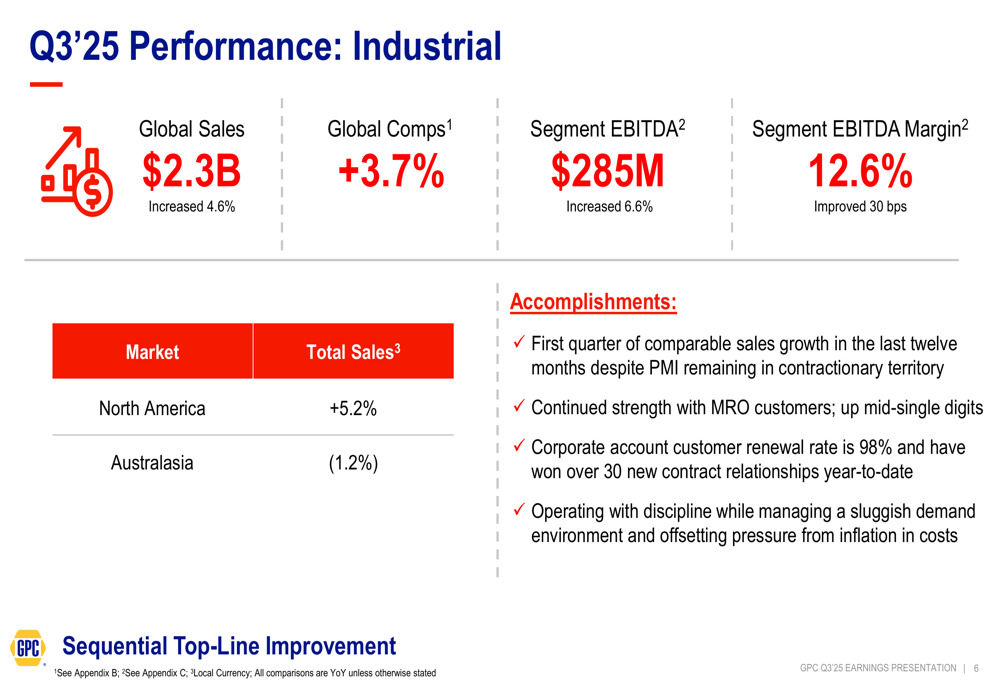 GPC delivered solid financial results for the third quarter, with global sales increasing 4.9% year-over-year to $6.3 billion. The company improved its gross margin by 60 basis points to 37.4% while adjusted EBITDA grew 10.4% to $526 million, representing an 8.4% margin improvement of 40 basis points compared to the prior year.