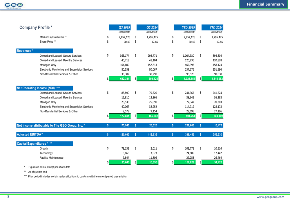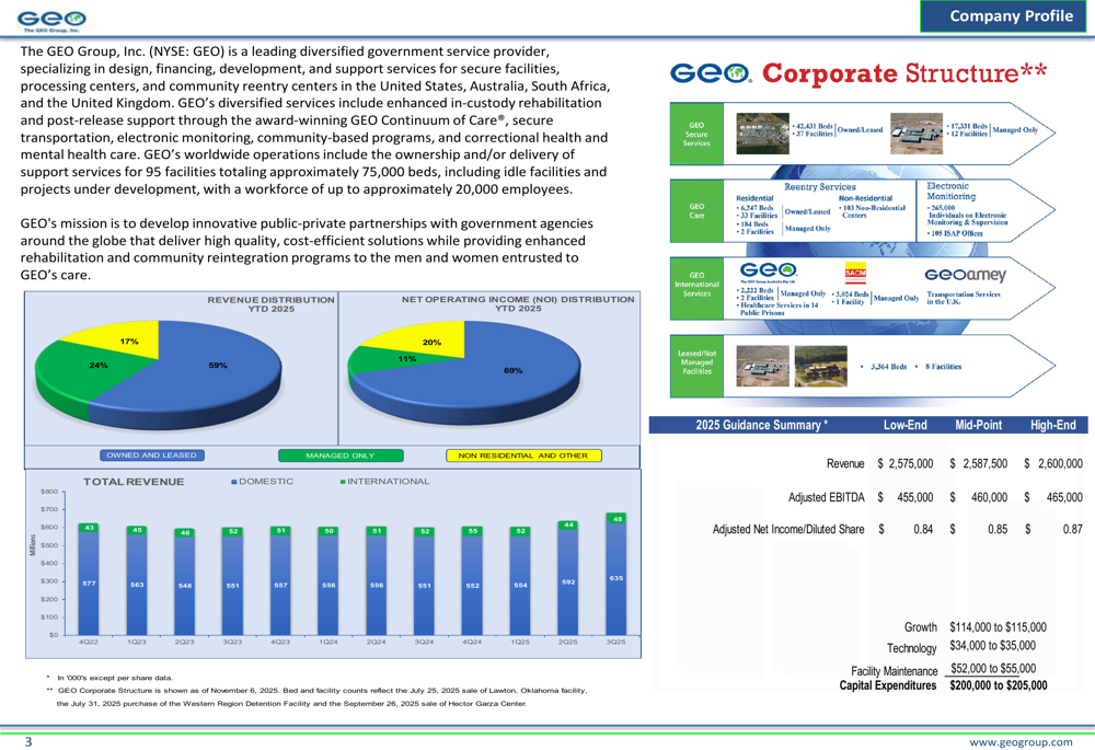 GEO's operational metrics showed improvements, with occupancy in Owned and Leased Secure Services facilities increasing to 88% in Q3 2025 from 84% in Q3 2024. Revenue-producing beds increased to 38,923 from 35,455 year-over-year.