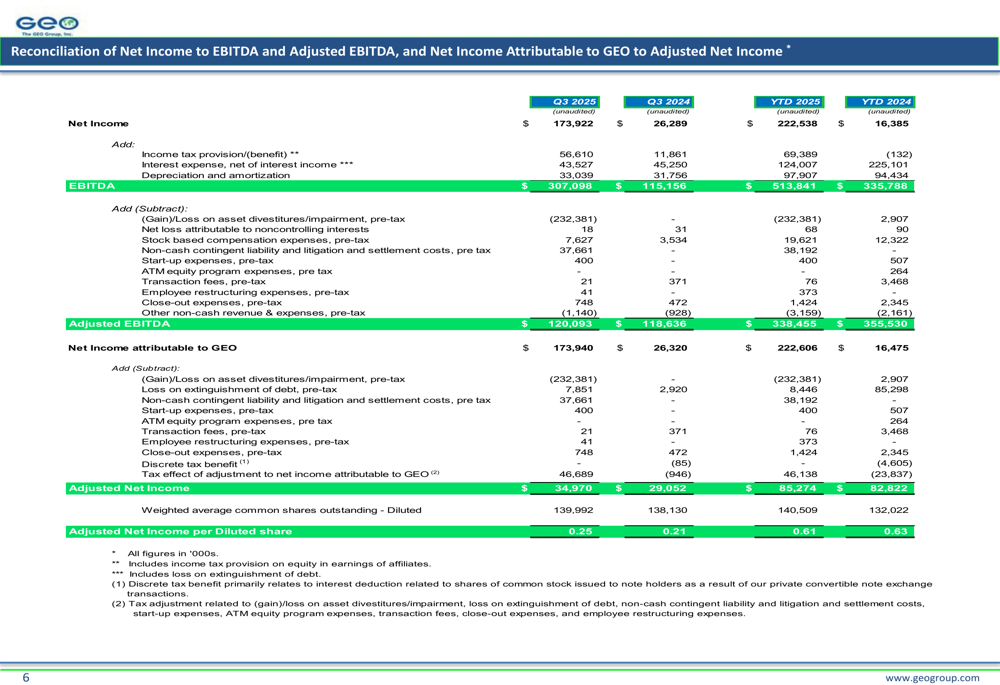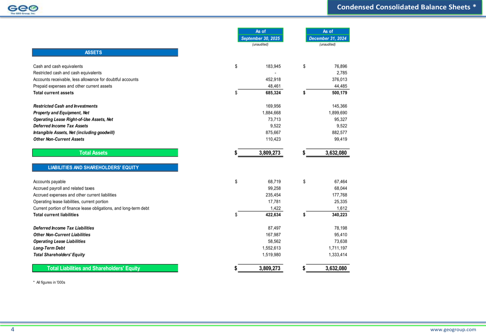 GEO's balance sheet showed improvements with cash and cash equivalents increasing to $183.9 million as of September 30, 2025, compared to $76.9 million at the end of 2024. Total assets grew to $3.81 billion from $3.63 billion, while long-term debt decreased to $1.55 billion from $1.71 billion over the same period.