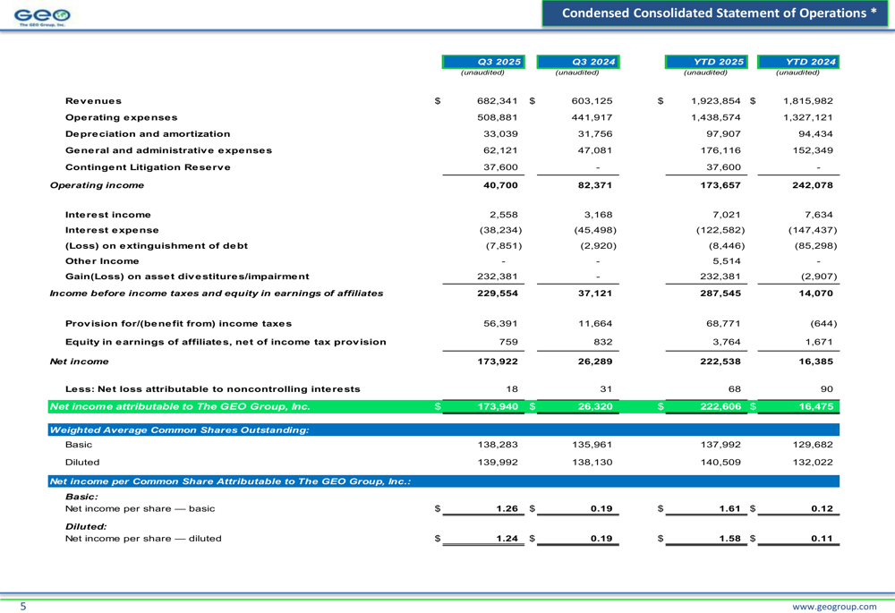 GEO Group reported Q3 2025 revenue of $682.3 million, a 13.1% increase from $603.1 million in the same period last year. The company's net income attributable to GEO soared to $173.9 million ($1.24 per diluted share), compared to $26.3 million ($0.19 per diluted share) in Q3 2024. This dramatic increase was largely driven by a $232.4 million gain on asset divestitures.