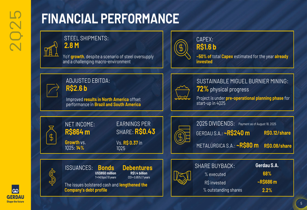 Gerdau delivered an adjusted EBITDA of R$2.6 billion in Q2 2025, representing a 6.6% increase from the previous quarter. The company reported steel shipments growth of 2.8 million tonnes year-over-year, while maintaining its focus on operational efficiency and sustainability initiatives.