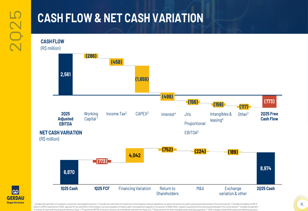 The company maintained a strong financial position with a disciplined approach to capital allocation. Gerdau’s cash flow and debt management strategy is reflected in its liquidity position, with an average debt term of 7.2 years and competitive financing costs (average cost in BRL:CDI + 0.49% Y/Y and USD: 5.6% Y/Y).