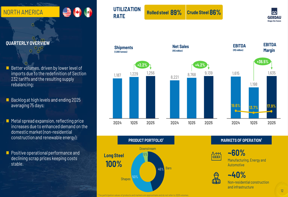 North America emerged as the standout performer for Gerdau in Q2 2025, with significant margin expansion driving results. The segment benefited from robust volumes, metal spread expansion, and decreased imports following the redefinition of Section 232 tariffs, which helped rebalance supply in the region.