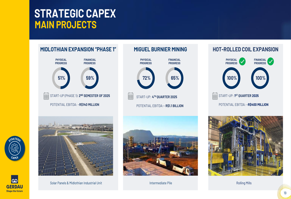 Gerdau continues to advance its key strategic projects, with significant progress reported across its major initiatives. The Miguel Burnier Mining project has reached 72% physical completion and is on track for start-up in the fourth quarter of 2025. This sustainable mining operation is currently in the pre-operational planning phase.