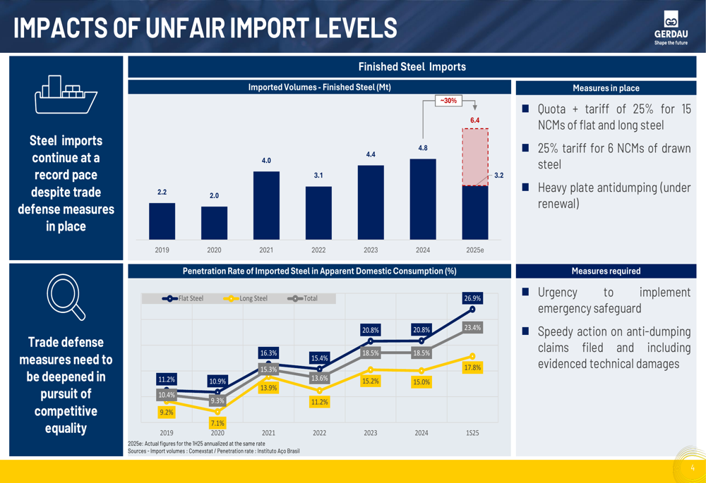 The company highlighted the urgent need for enhanced trade defense measures, including emergency safeguards and expedited action on anti-dumping claims. The presentation emphasized that despite existing measures (quota + 25% tariff for certain steel products), imports continue at a record pace.