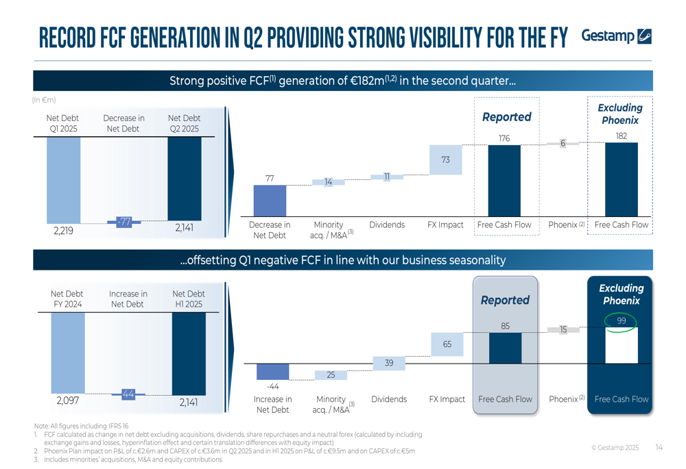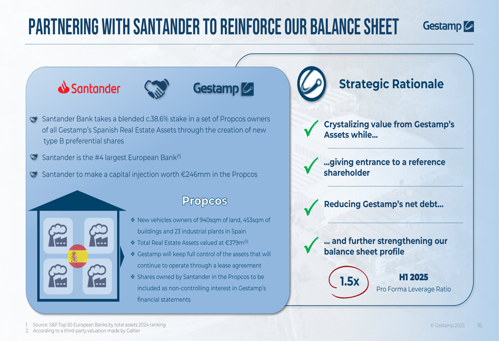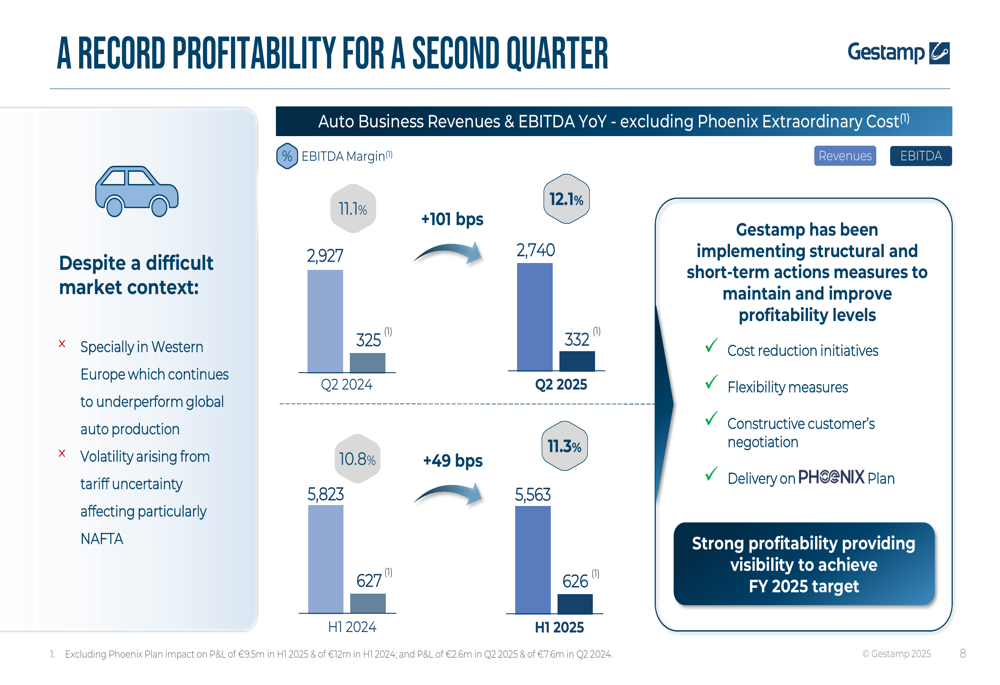 Gestamp highlighted two key strategic initiatives: the Phoenix Plan and a partnership with Santander Bank. The Phoenix Plan, focused on improving NAFTA profitability, showed progress with sequential EBITDA margin improvement from 6.4% in Q1 to 7.7% in Q2 2025, tracking toward the full-year target of 8%.
