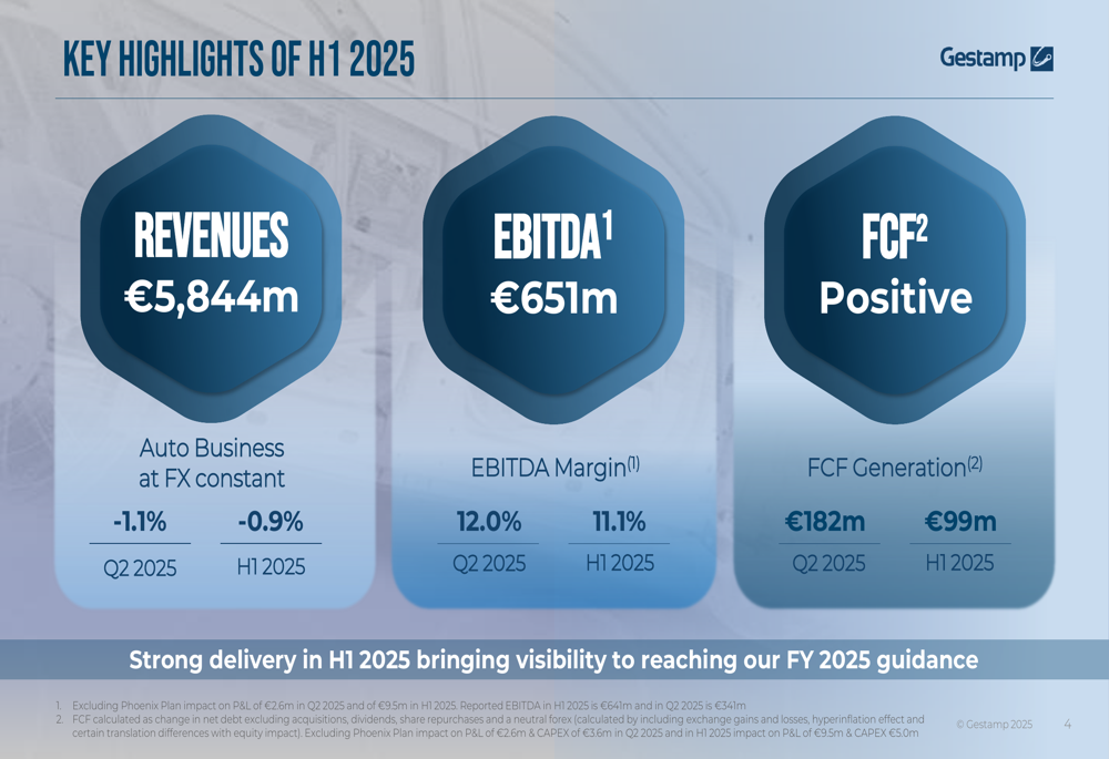 For the entire first half, Gestamp reported EBITDA of €651 million with an 11.1% margin, alongside positive free cash flow generation of €99 million. The company’s auto business at constant exchange rates declined by 0.9% in H1 2025, underperforming the market by 0.6 percentage points on a weighted basis.