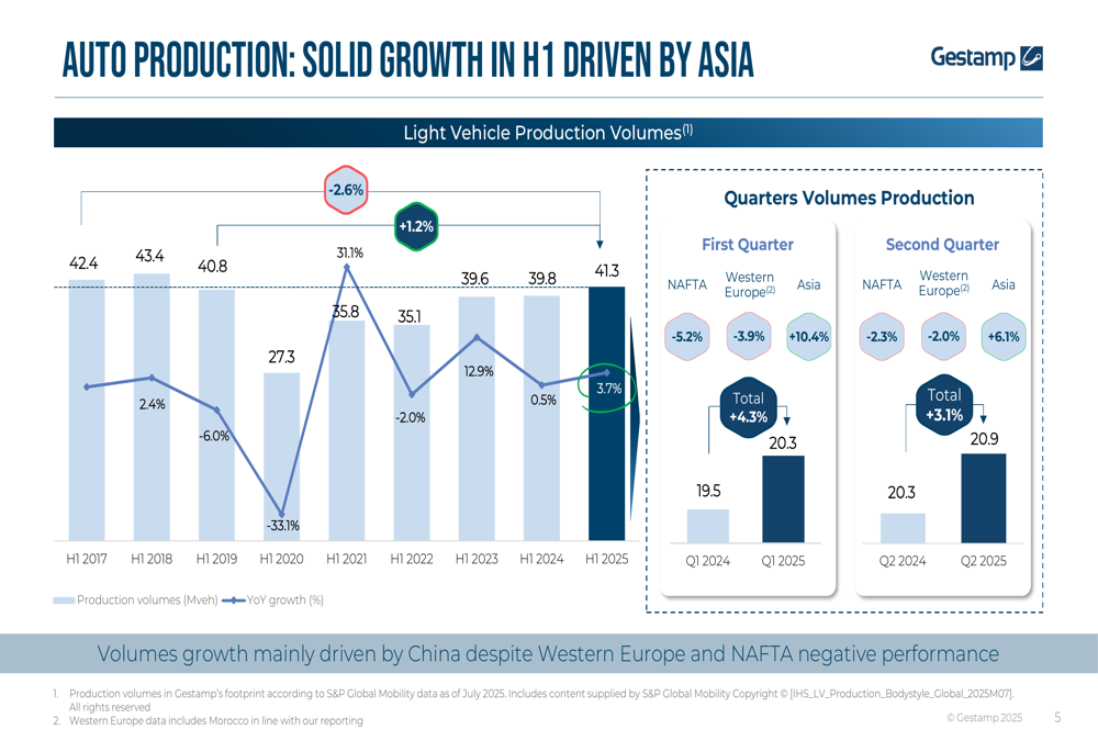 The company operated in a mixed global automotive production environment, with overall light vehicle production growing 1.2% in H1 2025, primarily driven by strong performance in Asia (+8.2%) that offset declines in Western Europe (-3.0%) and North America (-3.7%).