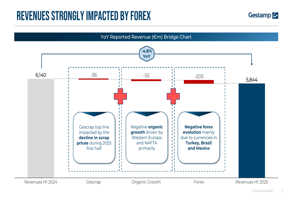 Gestamp’s revenue decline was significantly impacted by currency effects, with forex accounting for a negative €205 million impact. Additional headwinds included a €36 million decline from Gescrap (due to falling scrap prices) and a €55 million reduction from organic growth, primarily in Western Europe and NAFTA regions.