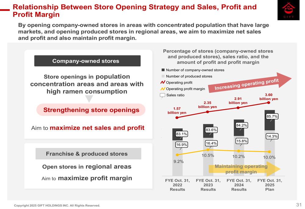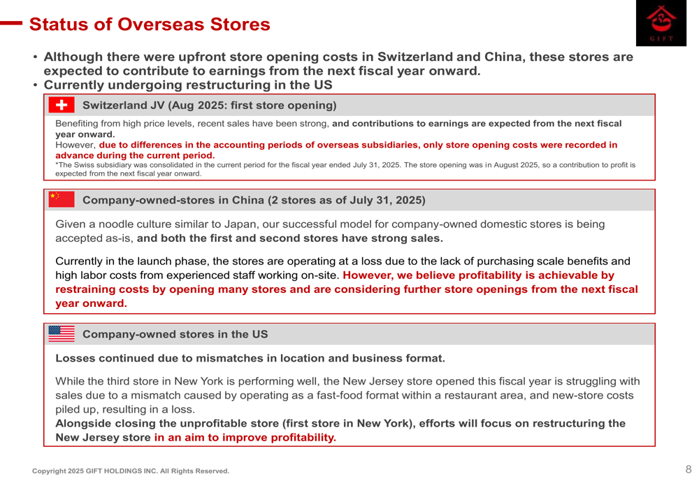 GIFT HOLDINGS continues its aggressive store expansion strategy, adding 60 stores compared to the end of the previous fiscal year. As of July 31, 2025, the company operated a total of 870 stores, including 260 company-owned stores, 575 produced stores, 27 franchise stores, and 8 outsourced stores.