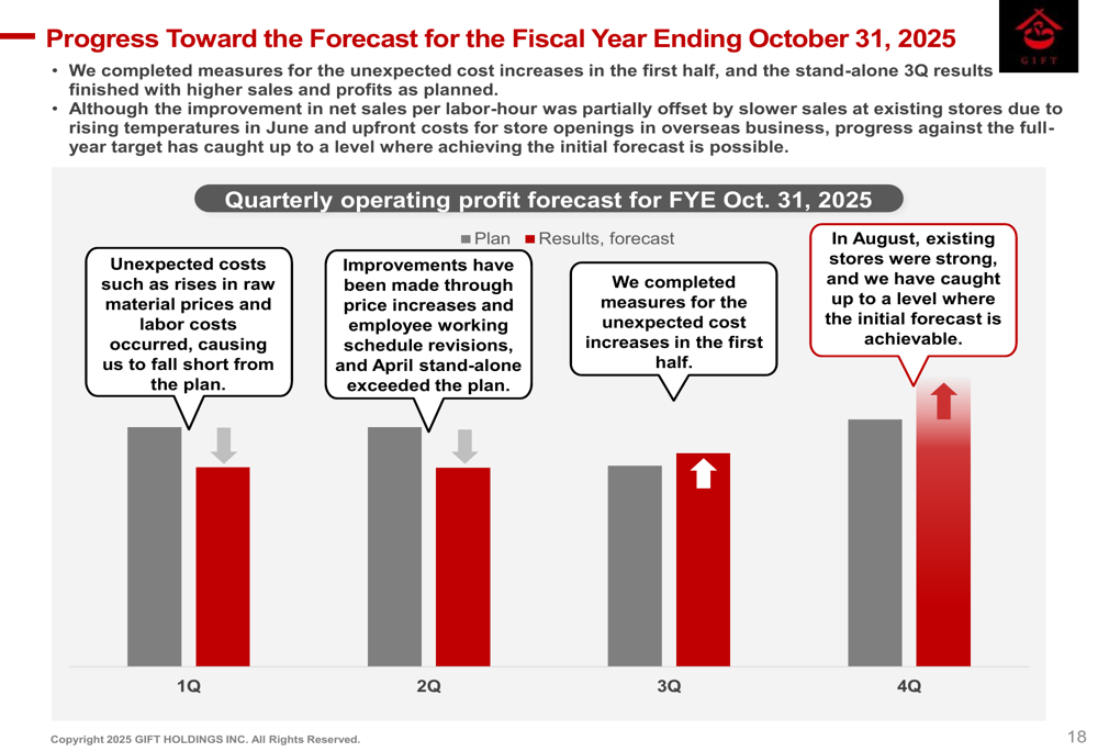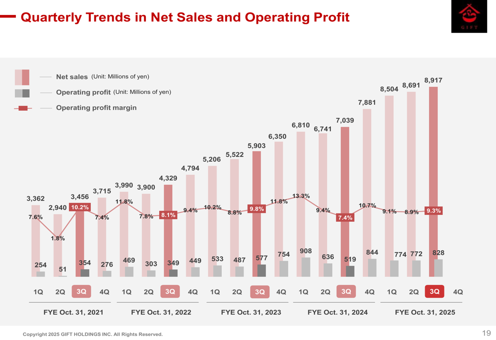 In terms of shareholder returns, GIFT HOLDINGS aims for a dividend payout ratio of 20.0% or more, with both interim and year-end dividends planned at 11.0 yen each, for a total annual dividend of 22.0 yen.