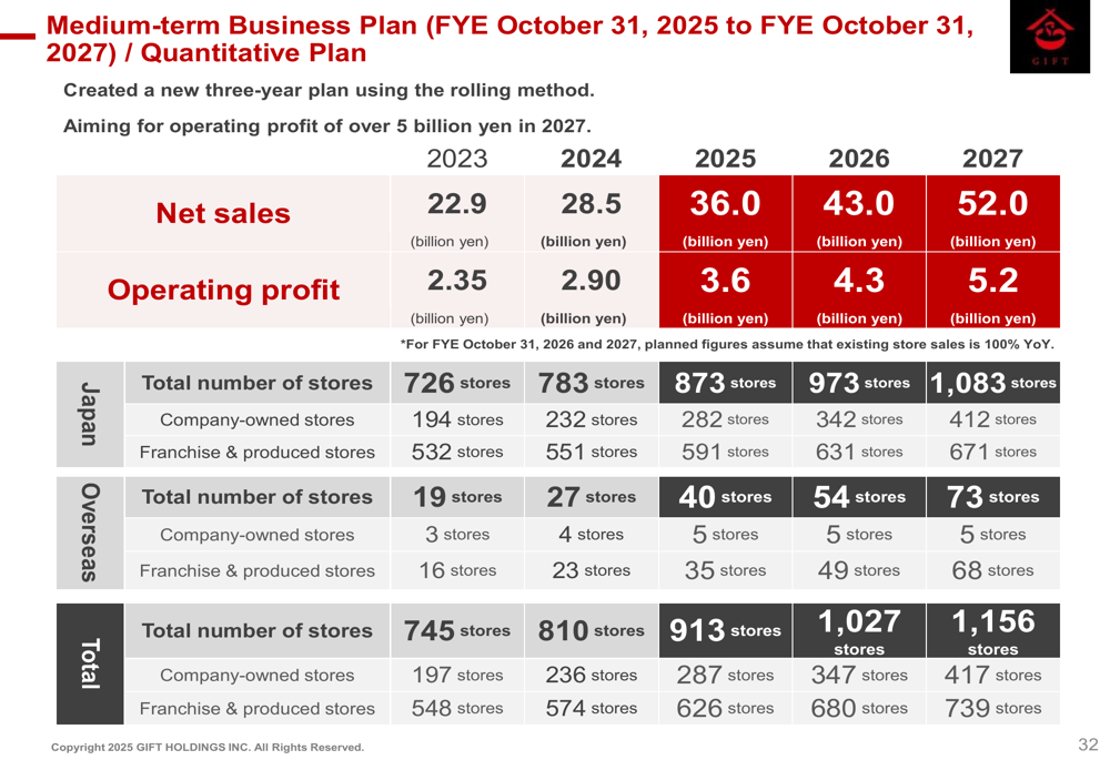 The revised plan sets ambitious targets for the fiscal year ending October 31, 2027, including net sales of 52.0 billion yen, operating profit of 5.2 billion yen, and a total of 1,156 stores globally.