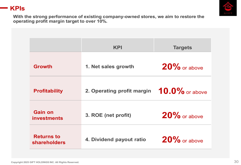 To achieve these targets, GIFT HOLDINGS has established clear key performance indicators (KPIs), including net sales growth of 20% or above, operating profit margin of 10.0% or above, ROE of 20% or above, and a dividend payout ratio of 20% or above.