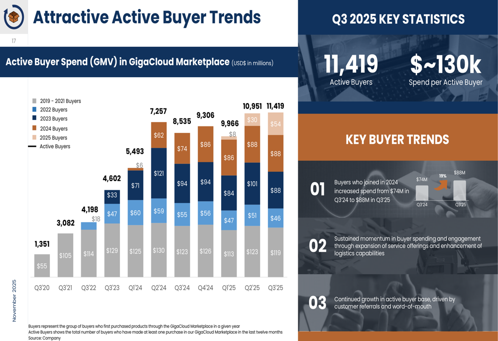 According to the presentation, buyers who joined in 2024 increased their spending from $74 million in Q3 2024 to $88 million in Q3 2025, demonstrating strong retention and growing wallet share. This trend supports GigaCloud's claim that its marketplace model drives sustained engagement and spending over time.