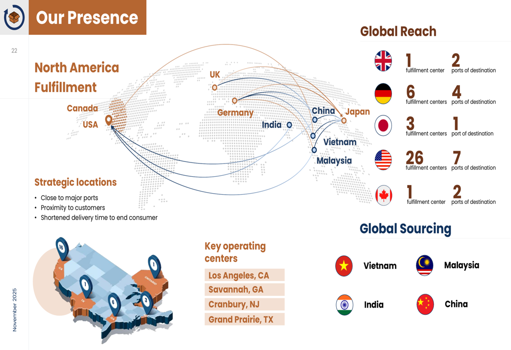 The company now operates 37 fulfillment facilities across five countries with over 10.9 million square feet of space under unified management. Its logistics network includes ocean transportation through 16 ports of destination, handling over 30,000 containers annually, and last-mile delivery capabilities that reach over 90% of customers in the continental United States within three days.