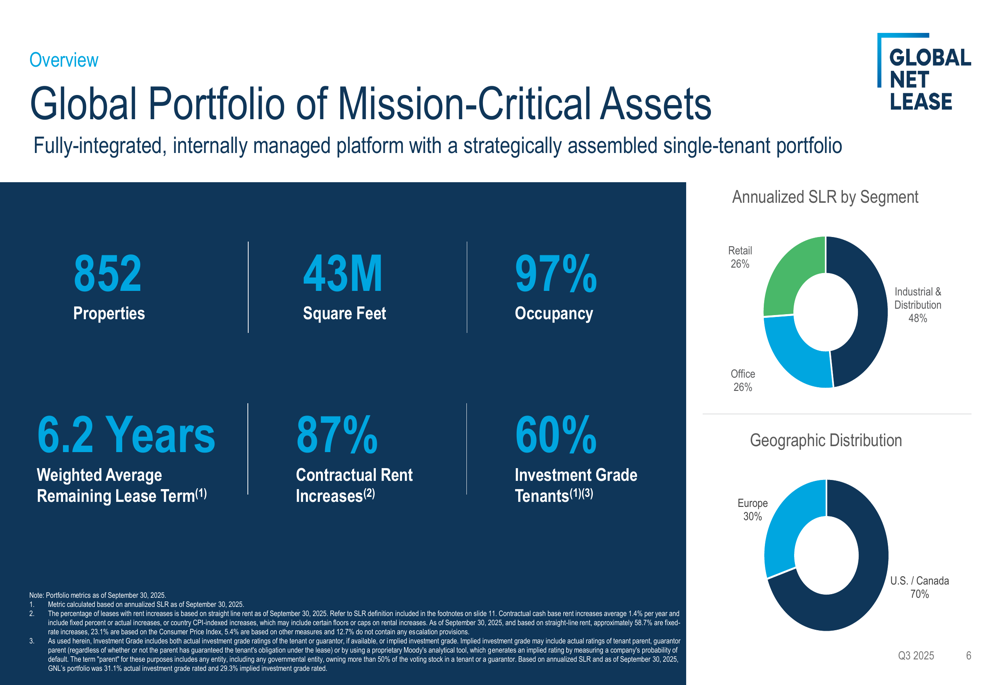 GNL’s portfolio now consists of 852 properties spanning 43 million square feet, maintaining a strong 97% occupancy rate. The portfolio features a weighted average remaining lease term of 6.2 years, with 87% of leases containing contractual rent increases and 60% of tenants holding investment-grade ratings.