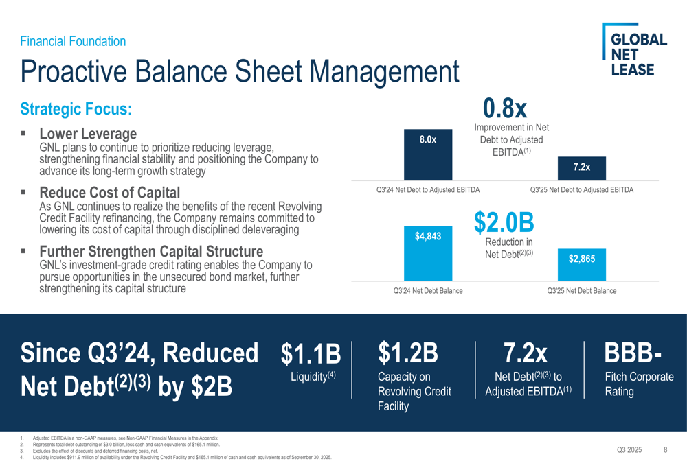 Global Net Lease Inc. (NYSE:GNL) shares climbed 6.09% to $7.55 on November 6, 2025, as investors responded positively to the company’s third-quarter investor presentation despite an earnings miss. The real estate investment trust highlighted significant progress in its strategic transformation, including substantial debt reduction and a credit rating upgrade.