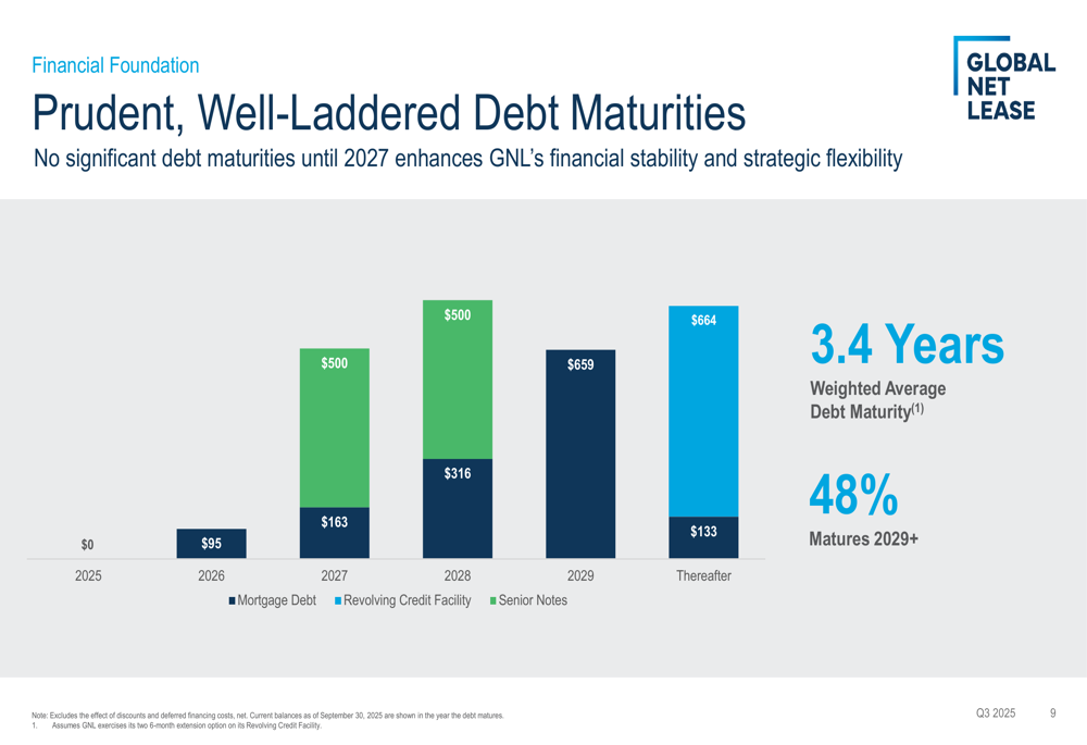 The company’s debt profile has improved substantially, with total debt reduced to $3.03 billion. GNL maintains a weighted average interest rate of 4.2% and an interest coverage ratio of 2.9x. Importantly, the company has no significant debt maturities until 2027, providing financial flexibility in the near term.