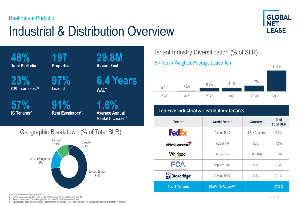 The company’s property mix is well-balanced across three segments: industrial and distribution (48%), retail (26%), and office (26%). This diversification helps mitigate sector-specific risks while allowing GNL to optimize its holdings.