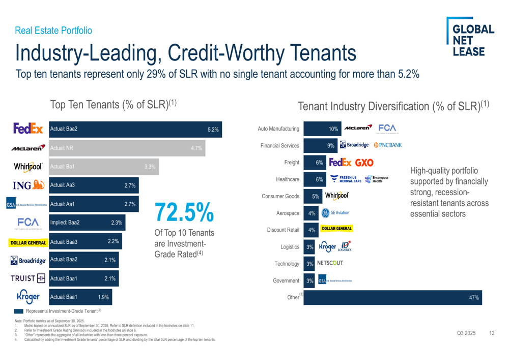GNL’s tenant base represents another strength, with the top ten tenants accounting for only 29% of straight-line rent (SLR), indicating limited concentration risk. The portfolio is further diversified across industries, with auto manufacturing (10%), financial services (9%), and freight (6%) representing the largest sectors.