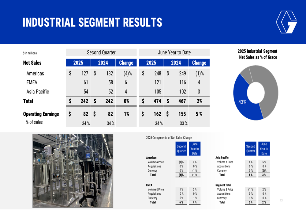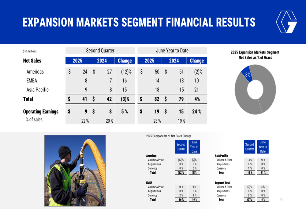Regionally, Graco continues to focus on expanding its presence in EMEA and Asia Pacific, where growth remains robust, while addressing challenges in the Americas market.