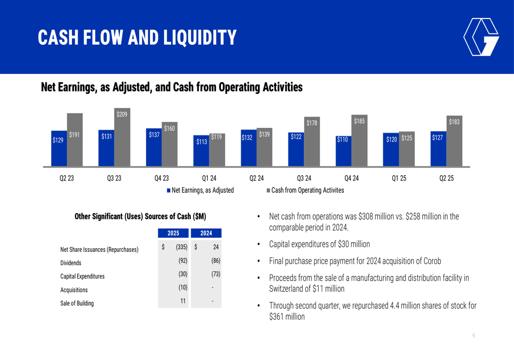 Graco’s cash position remains strong, with net cash from operations reaching $308 million compared to $258 million in the comparable period of 2024. The company continued its share repurchase program, buying back 4.4 million shares for $361 million through the second quarter.