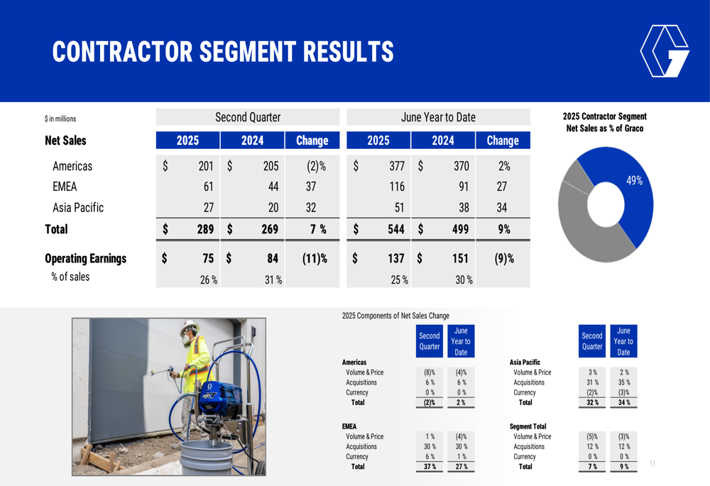 A closer examination of Graco’s sales performance reveals significant regional disparities. While the Americas region struggled with a 3% decline in Q2 sales, EMEA (Europe, Middle East, and Africa) delivered impressive 19% growth, and Asia Pacific grew by 12%.