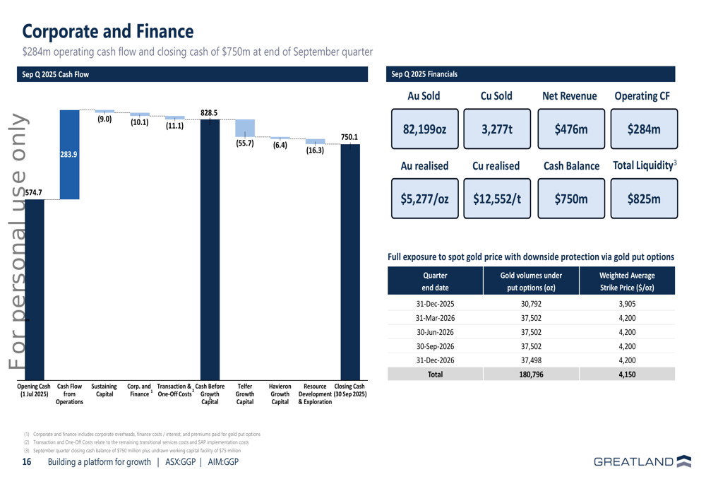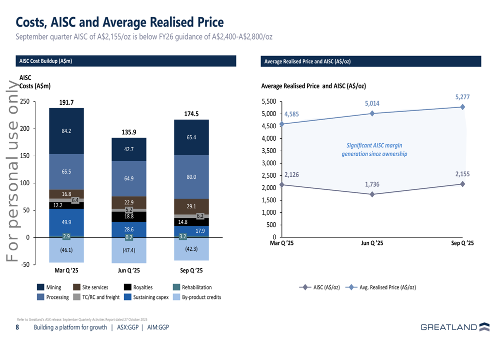 Cost control remained a priority for Greatland, with the September quarter AISC of A$2,155/oz coming in below the FY26 guidance range of A$2,400-A$2,800/oz. The cost structure breakdown and margin analysis is shown in this detailed chart: