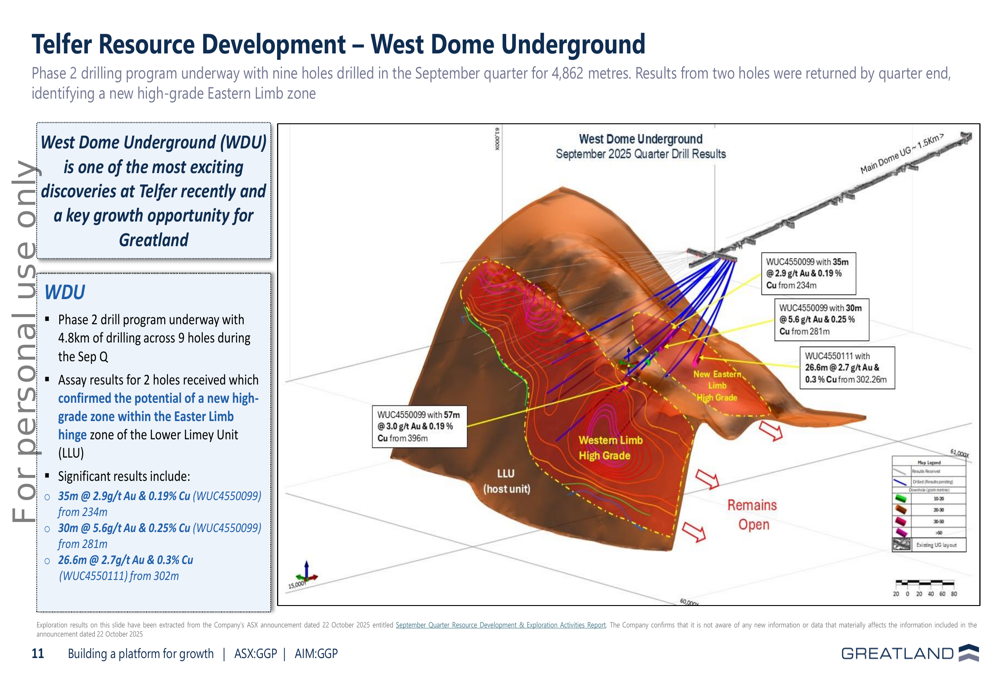 A significant development was the identification of a new high-grade zone in the West Dome Underground, which the company described as "one of the most exciting discoveries at Telfer recently." Drilling results included impressive intercepts such as 30m @ 5.6g/t Au & 0.25% Cu.