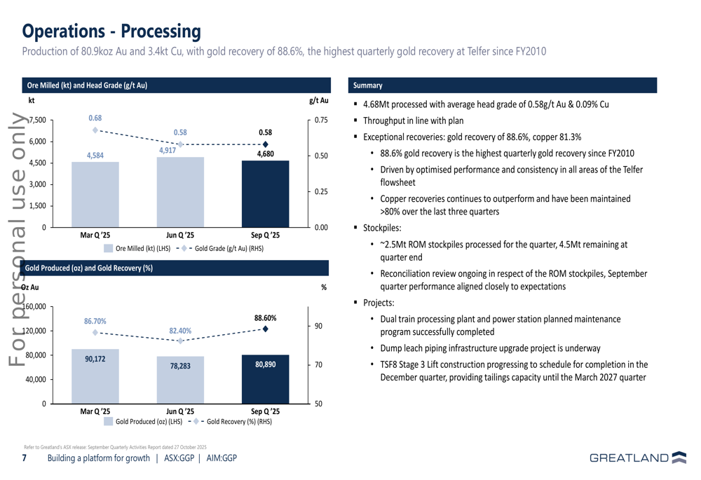 Greatland Resources reported production of 80,900 ounces of gold and 3,400 tonnes of copper for the September quarter at an All-In Sustaining Cost (AISC) of A$2,155 per ounce. The company achieved gold recovery of 88.6%, marking the highest quarterly recovery rate at Telfer since FY2010.