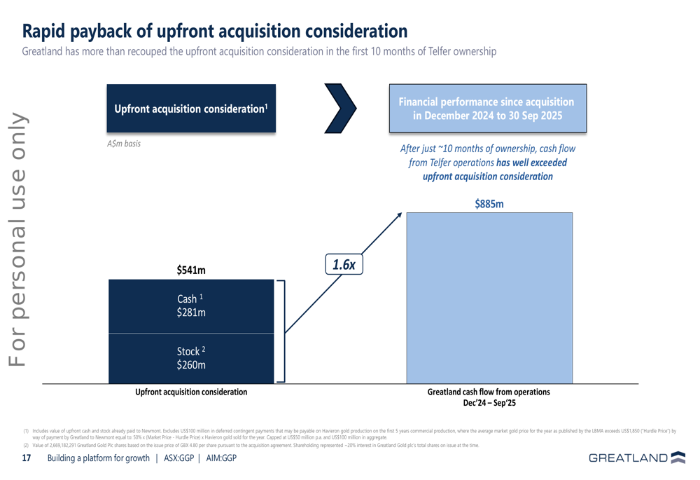 One of the most impressive financial achievements highlighted in the presentation was the rapid payback of the acquisition consideration. Since completing the acquisition in December 2024, Greatland has generated A$885 million in operating cash flow over just 10 months, representing 1.6 times the upfront acquisition cost of A$541 million.